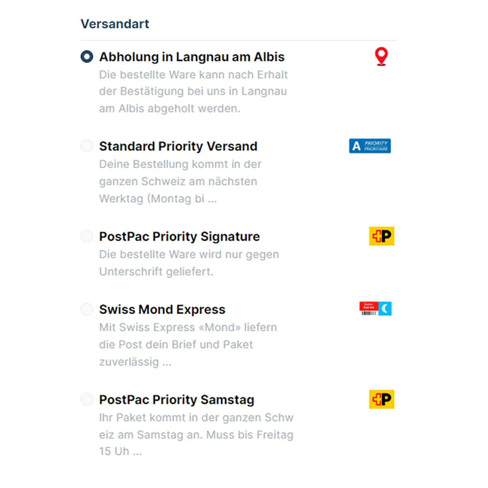 When shipping, you can then select pick up in Langnau am Albis (if you select prepayment as the payment method, this shipping method is not offered)